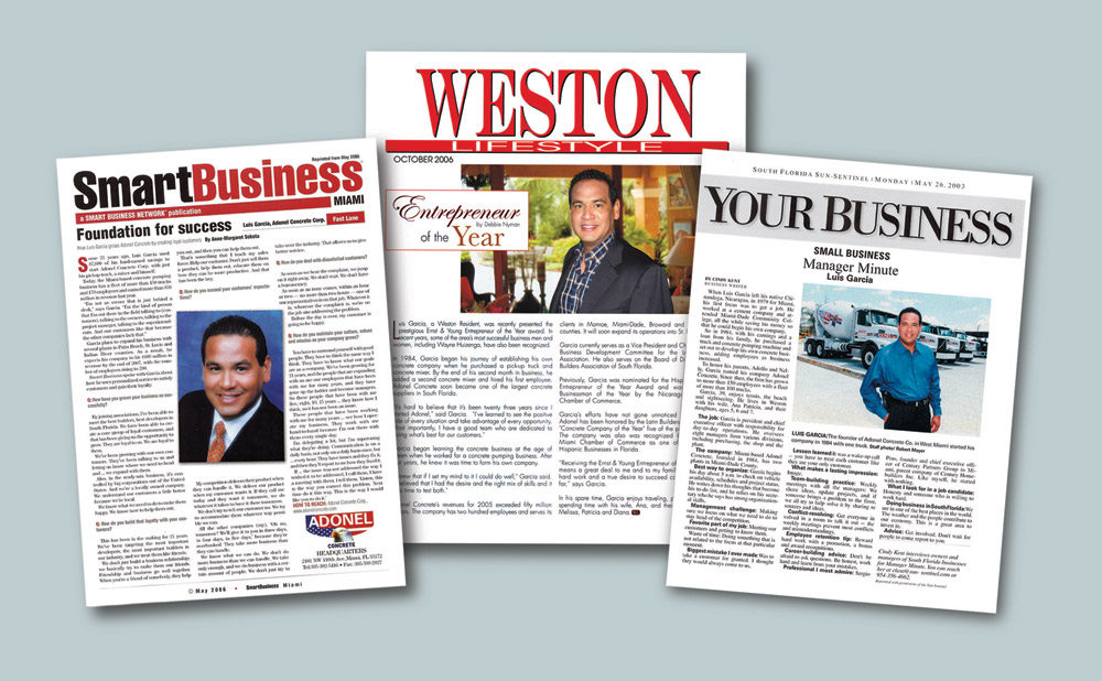 The media relations campaign resulted in prominent news and feature stories in publications such as The Miami Herald, South Florida Business Journal, Daily Business Review, Ft. Lauderdale Sun-Sentinel, Miami Today, Smart Business magazine, Moneda, Florida Trend, El Nuevo Constructor, Proyecto, Diarios Las Americas, Doral Tribune, Real Estate Hoy, South Florida CEO, etc. Many articles included front-page profiles on the company and its president, Luis Garcia.